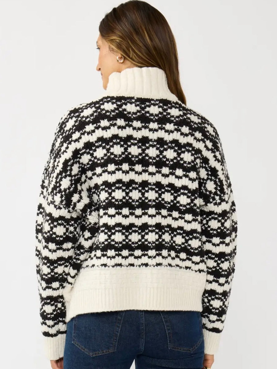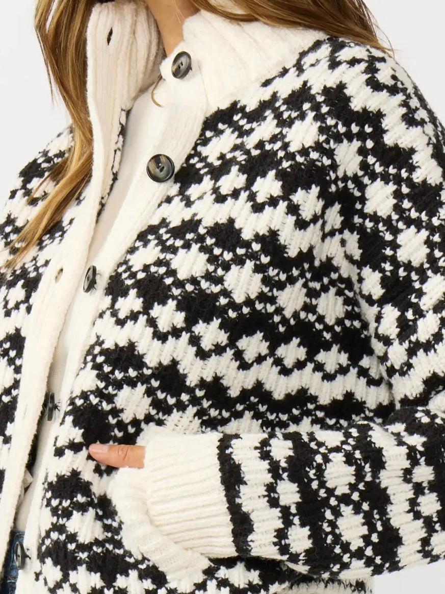 A cozy essential for the fall season, this sweater jacket features a bold black and white geo pattern with classic button down closure. Designed with a relaxed fit, front patch pockets, and thick ribbed cuffs and hem, it blends warmth and style effortlessly. Perfect for layering on chilly days.