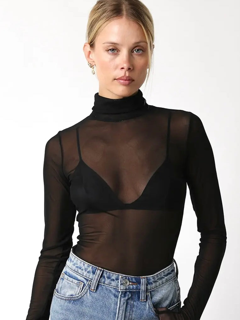 Embrace chic comfort with our Ivy Mesh Top, featuring a sleek turtle neck and flirtatious long sleeves. The delicate mesh adds a touch of playful allure, perfect for layering or wearing solo to turn heads wherever you go.