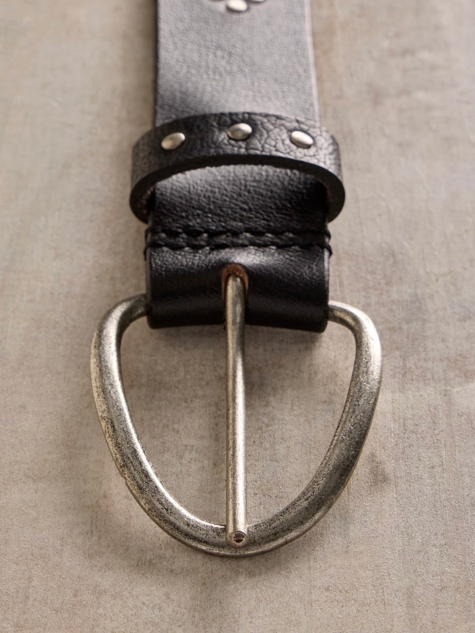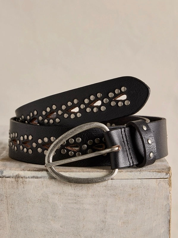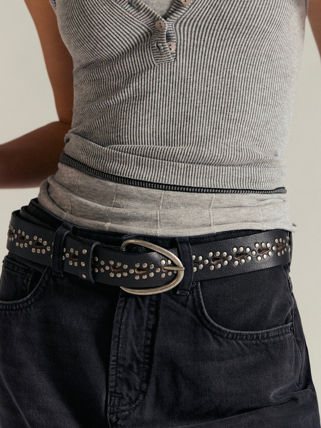 This so cool belt features teardrop cutouts and studded accents throughout for added edge to any ‘fit.