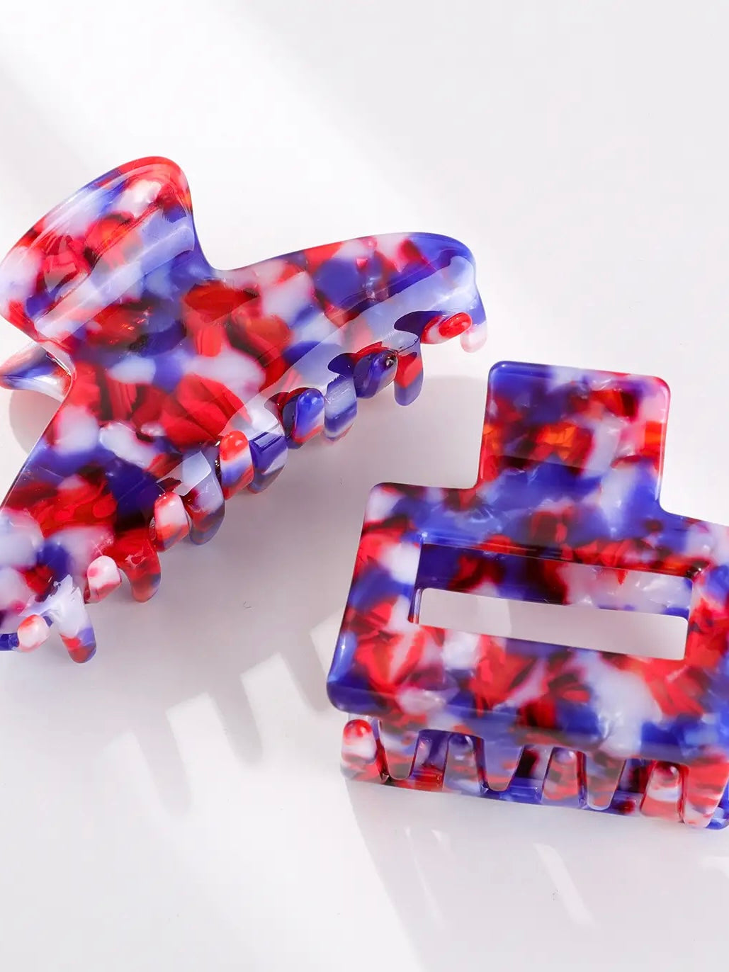 Introducing the Americana Assorted Claw Clips—our exclusive Summer collection design celebrating patriotic style. Featuring a striking red, white, and blue marbled print, these clips are perfect for Independence Day festivities and showing your Team USA spirit during the Olympics. Crafted from eco-friendly cellulose acetate derived from wood pulp and cotton, these clips offer superior durability and comfort compared to traditional acrylic or PVC alternatives. The biodegradable material ensures your style choice is kind to the planet. These medium-sized clips combine vibrant patriotic flair with sustainable craftsmanship that lasts.