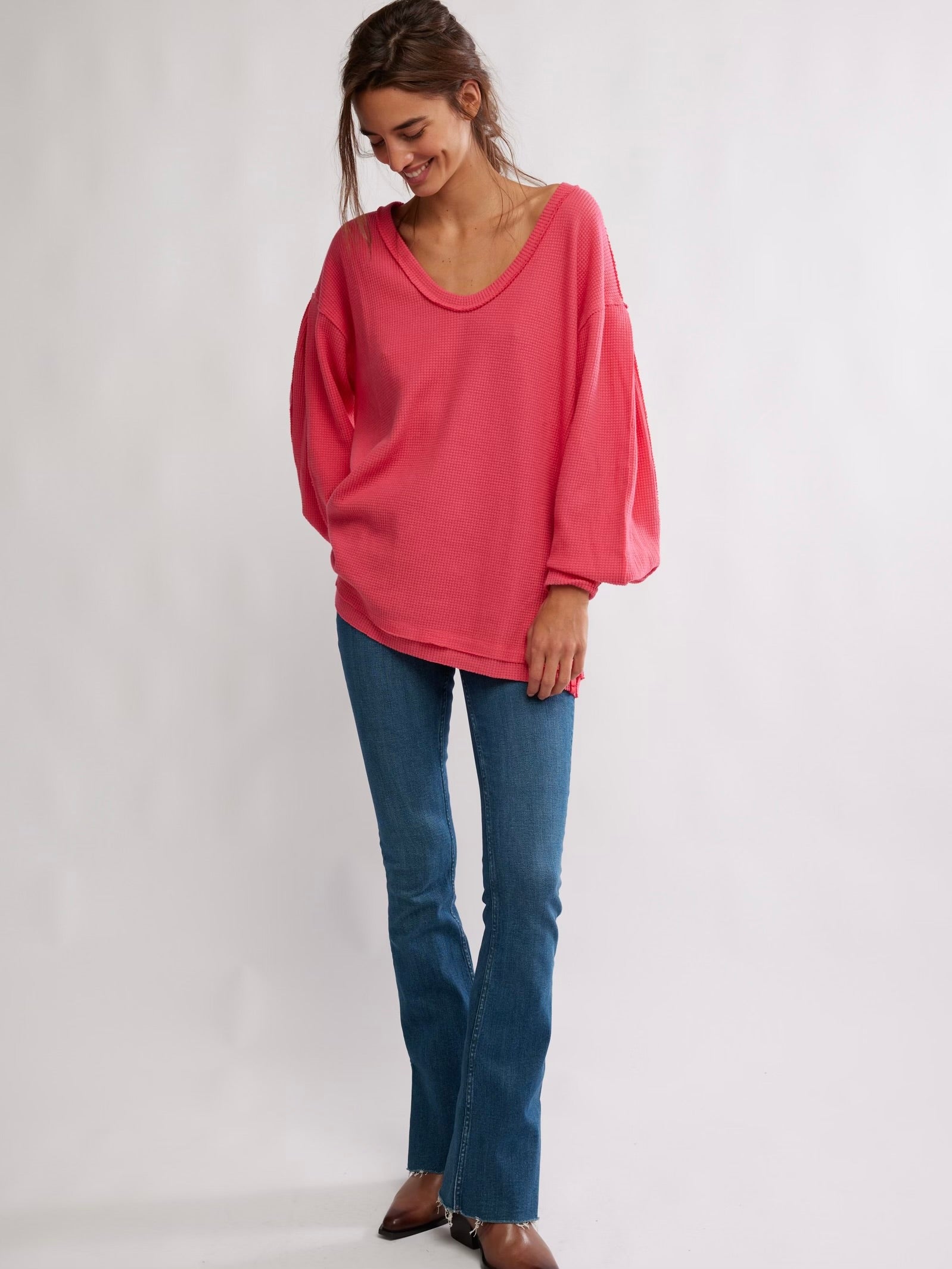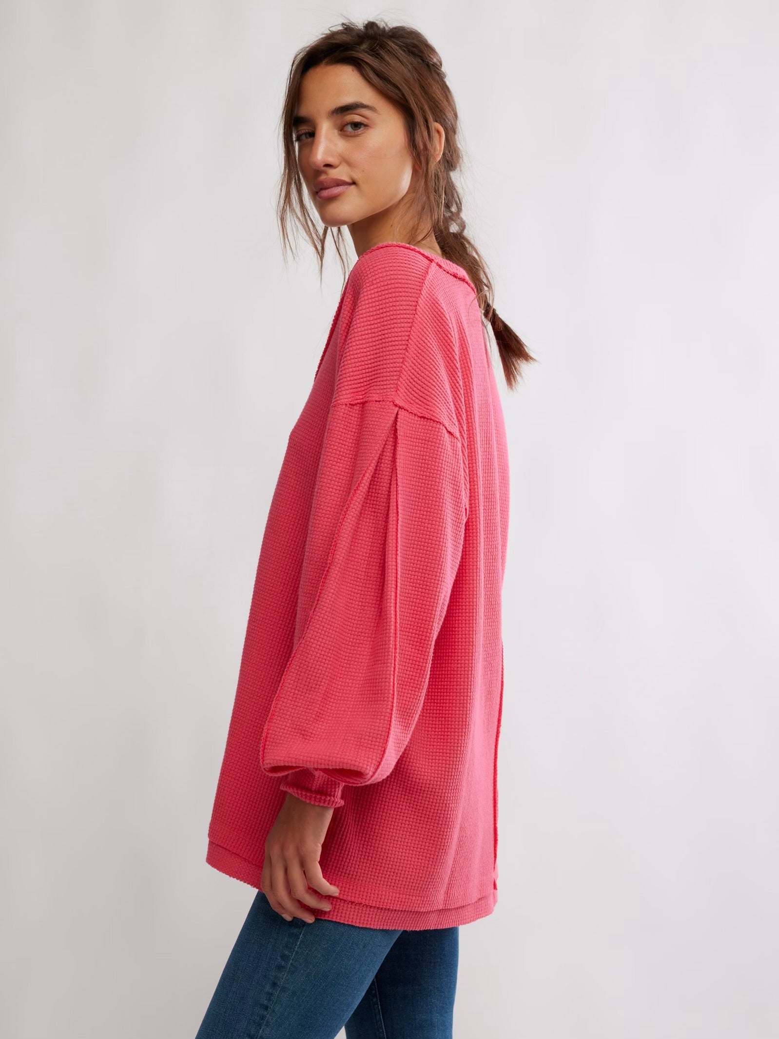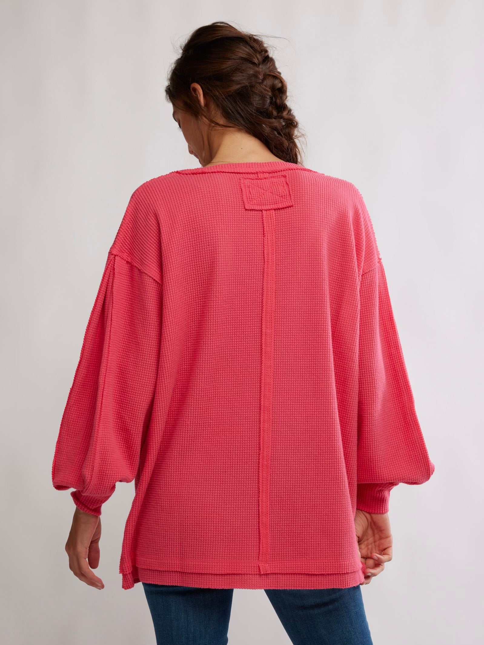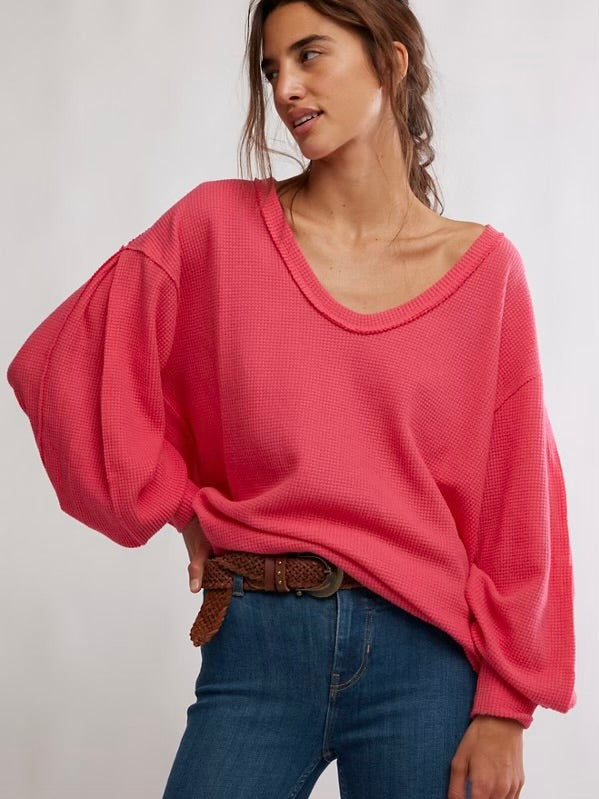 Cozy up in this oversized thermal from We The Free, featured in a waffle knit with a V-neckline and slouchy drop-shoulder sleeves for the perfect laidback look.