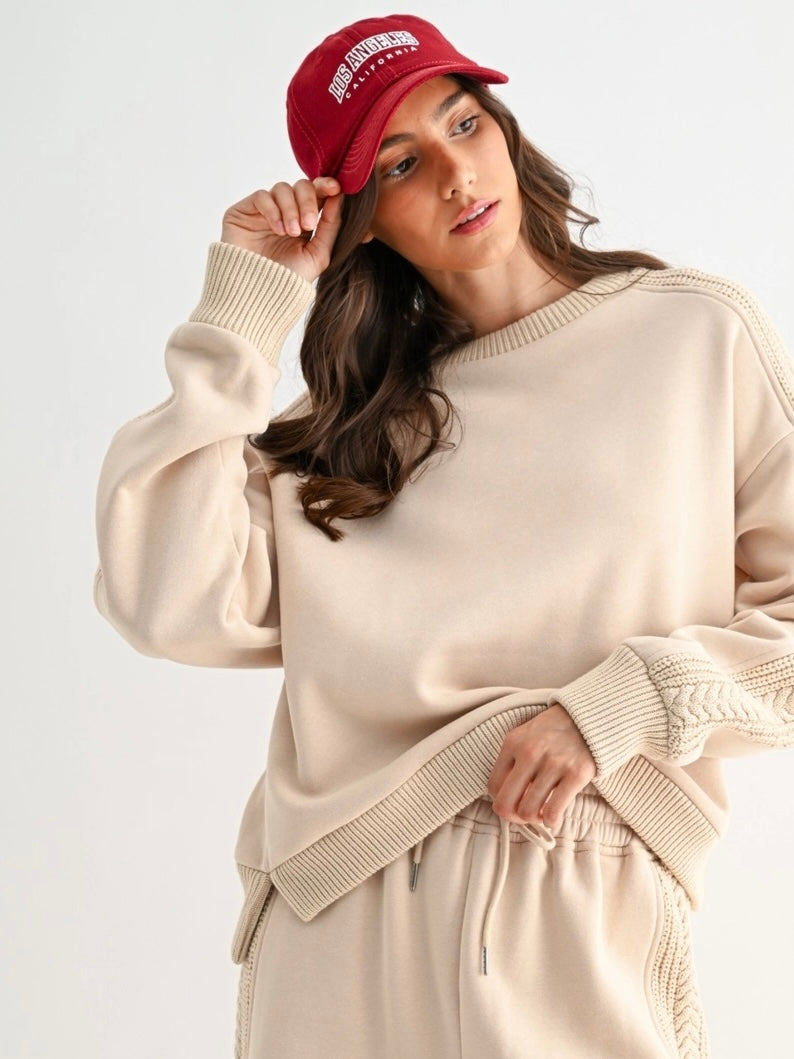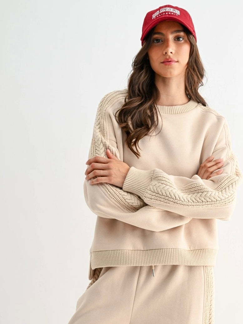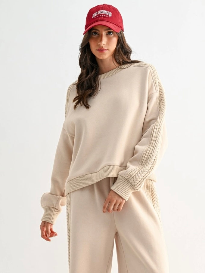 Accented with intricate cable knit trim running down the outer sleeves, adding a textured, elevated touch.  The top has a relaxed, drop-shoulder fit with ribbed cuffs and hem. Pair with the matching top