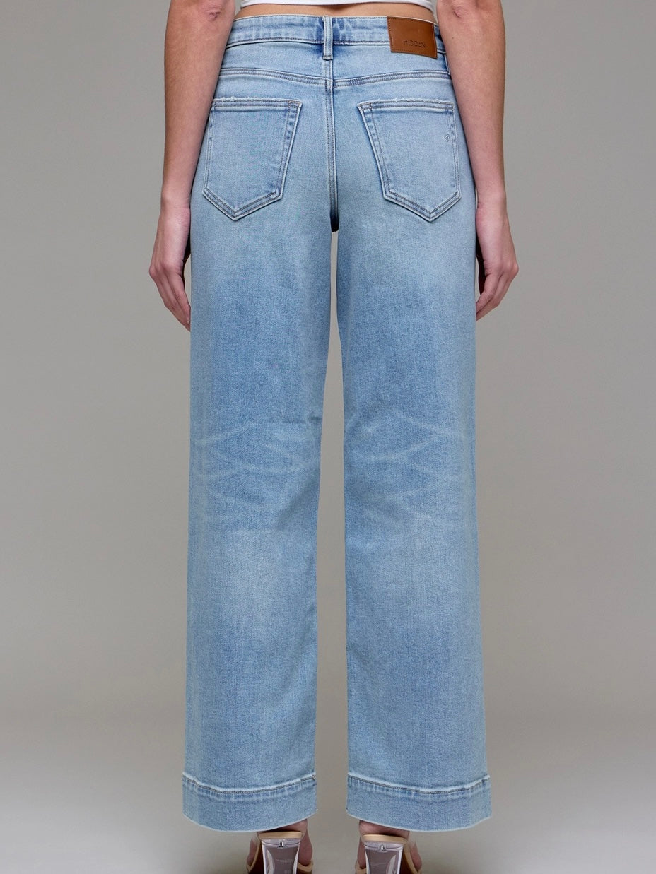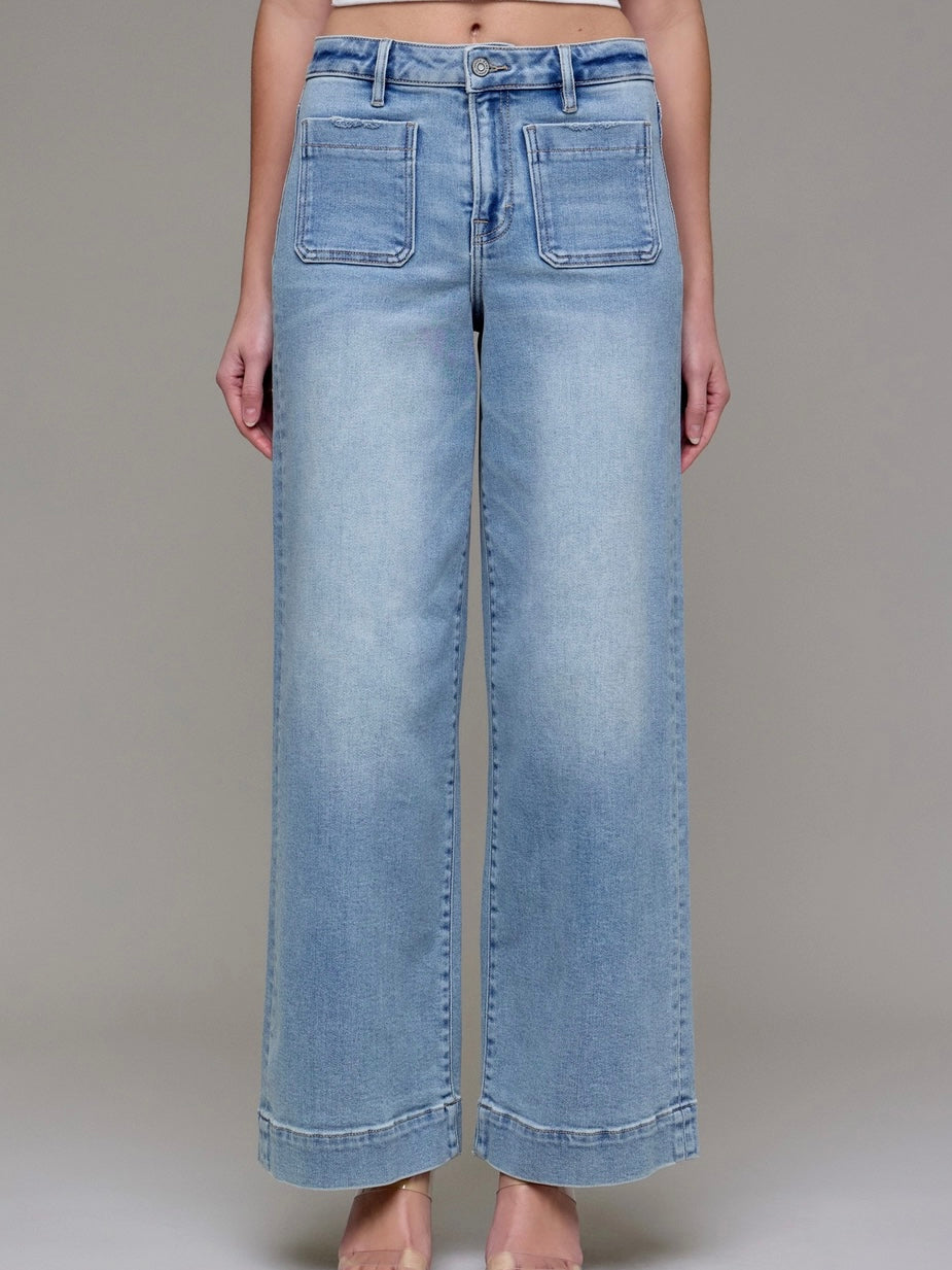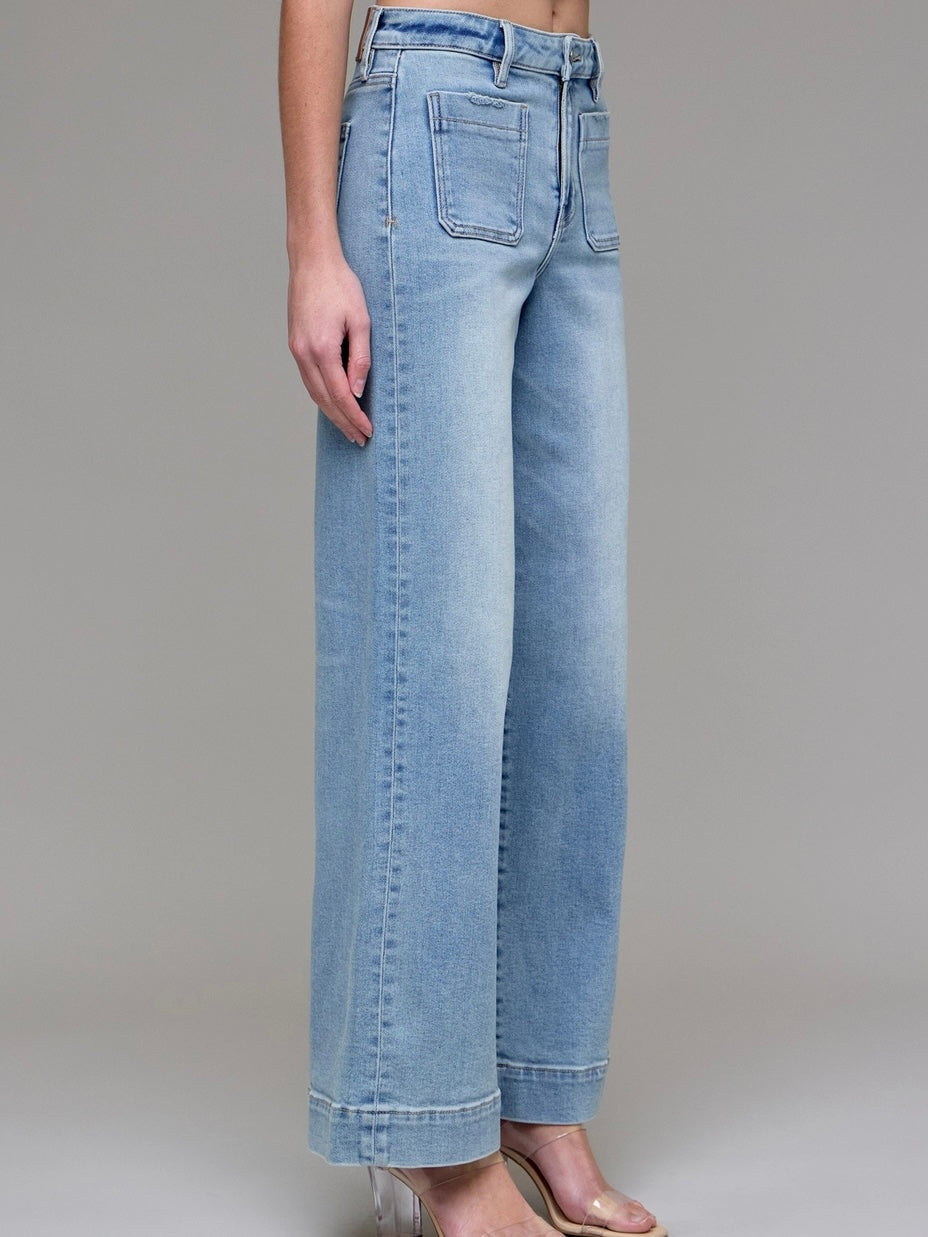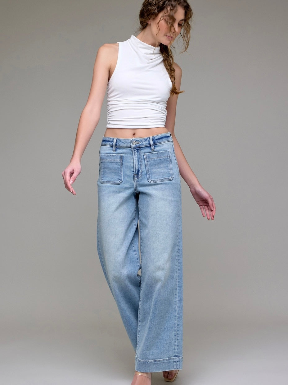 Light Wash Front Pocket Stretch Wide Leg jeans deliver effortless style with a flattering silhouette. Crafted from a premium cotton-blend fabric featuring 93% cotton, 5% polyester, and 2% spandex, these jeans offer comfortable stretch and durability. The wide-leg cut provides a modern, relaxed fit, while the front pocket detailing adds visual interest. With an 11½" front rise and 31" inseam, this style is designed for a balanced proportion. The blend of natural cotton with stretch fibers ensures all-day wearability without sacrificing shape retention.