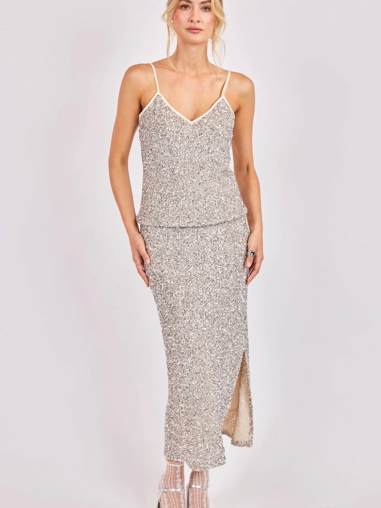 Elevate your evening wardrobe with this sophisticated sequin tank. Crafted with precision-placed sequins that catch light beautifully, this piece delivers understated glamour without overwhelming the silhouette. The sleek tank cut provides versatility—layer it under a blazer for refined elegance or wear solo for a statement look. Perfect for cocktail events, celebrations, or whenever you want to add a touch of shimmer to your ensemble. The quality construction ensures the sequins remain secure through wear and care, making this a lasting investment in your luxury collection.