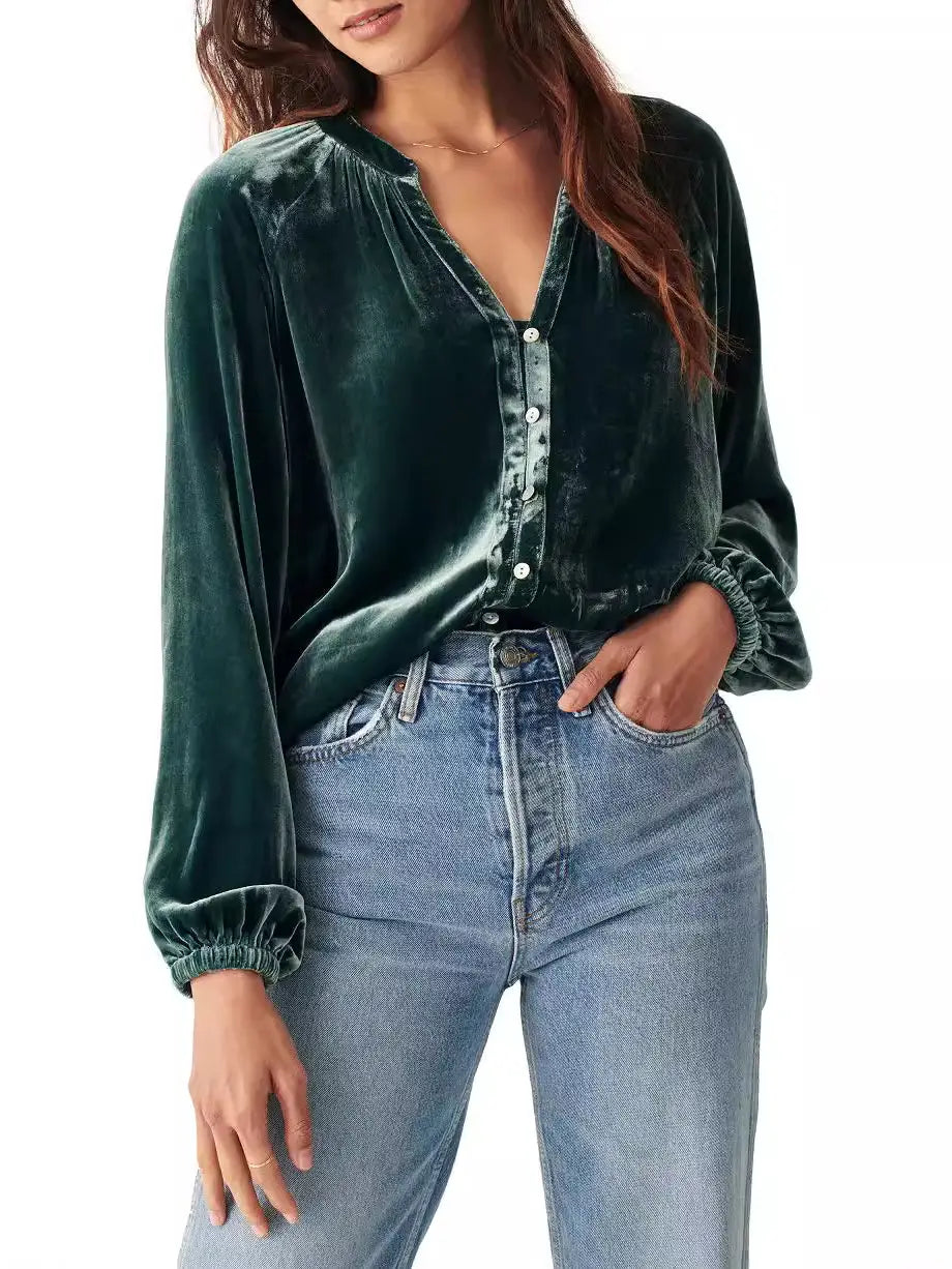 Elevate your wardrobe with this luxurious gold velvet long sleeve blouse in rich dark green. The soft, plush velvet fabric drapes beautifully while the gold accents add a touch of sophistication. Perfect for dressing up casual outfits or creating an elegant look for special occasions. The long sleeves provide versatile styling options year-round, making this blouse a timeless addition to any collection.