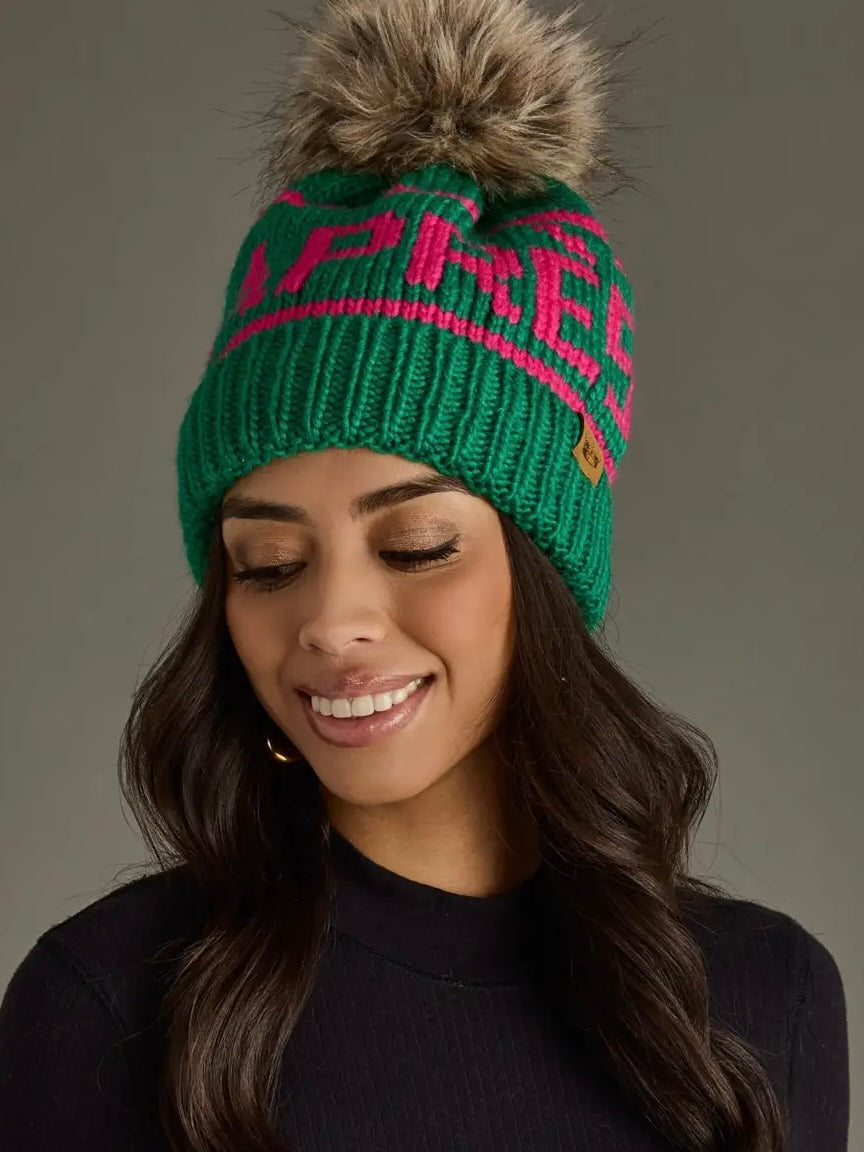Stay warm in style with this cozy après knit hat featuring a striking green and pink color block design. The natural faux fur pom adds a luxe touch, while the soft fleece lining keeps you comfortable all season long. Pairs perfectly with our matching mittens for a coordinated look.