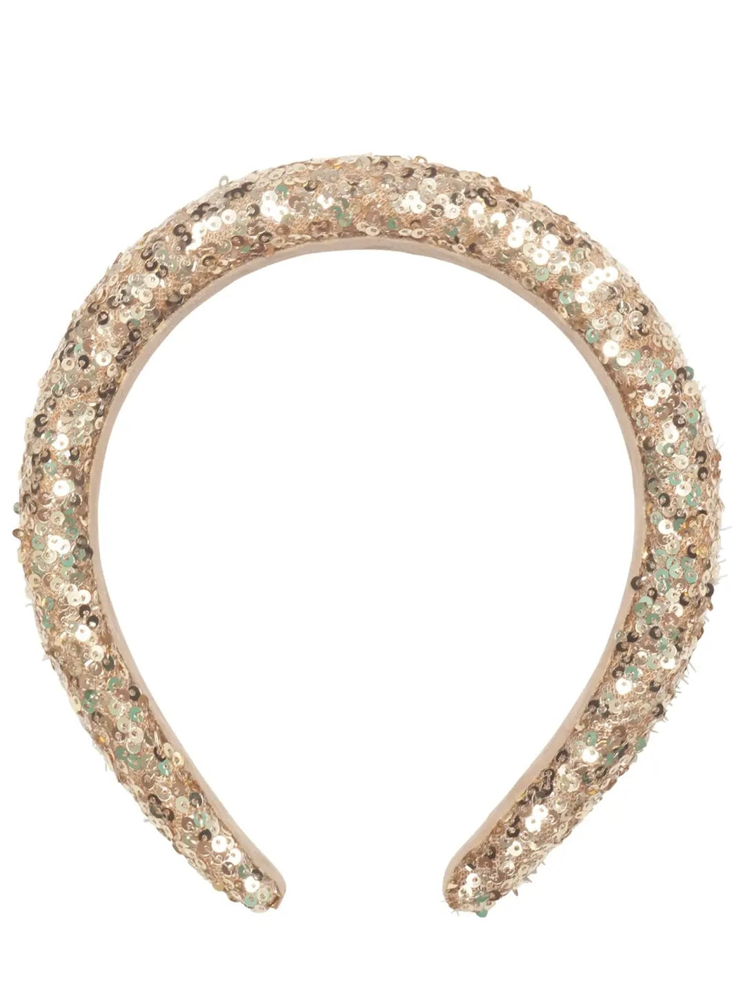 Our padded headband is made adorned with gold shimmering sequins and is the perfect party accessory! Our headbands are designed to ensure a comfortable fit for little heads. Matching scrunchies, bag, knitwear and earmuffs also available. Made using a recycled inner plastic headband. Not suitable for children under 36 months due to small parts.