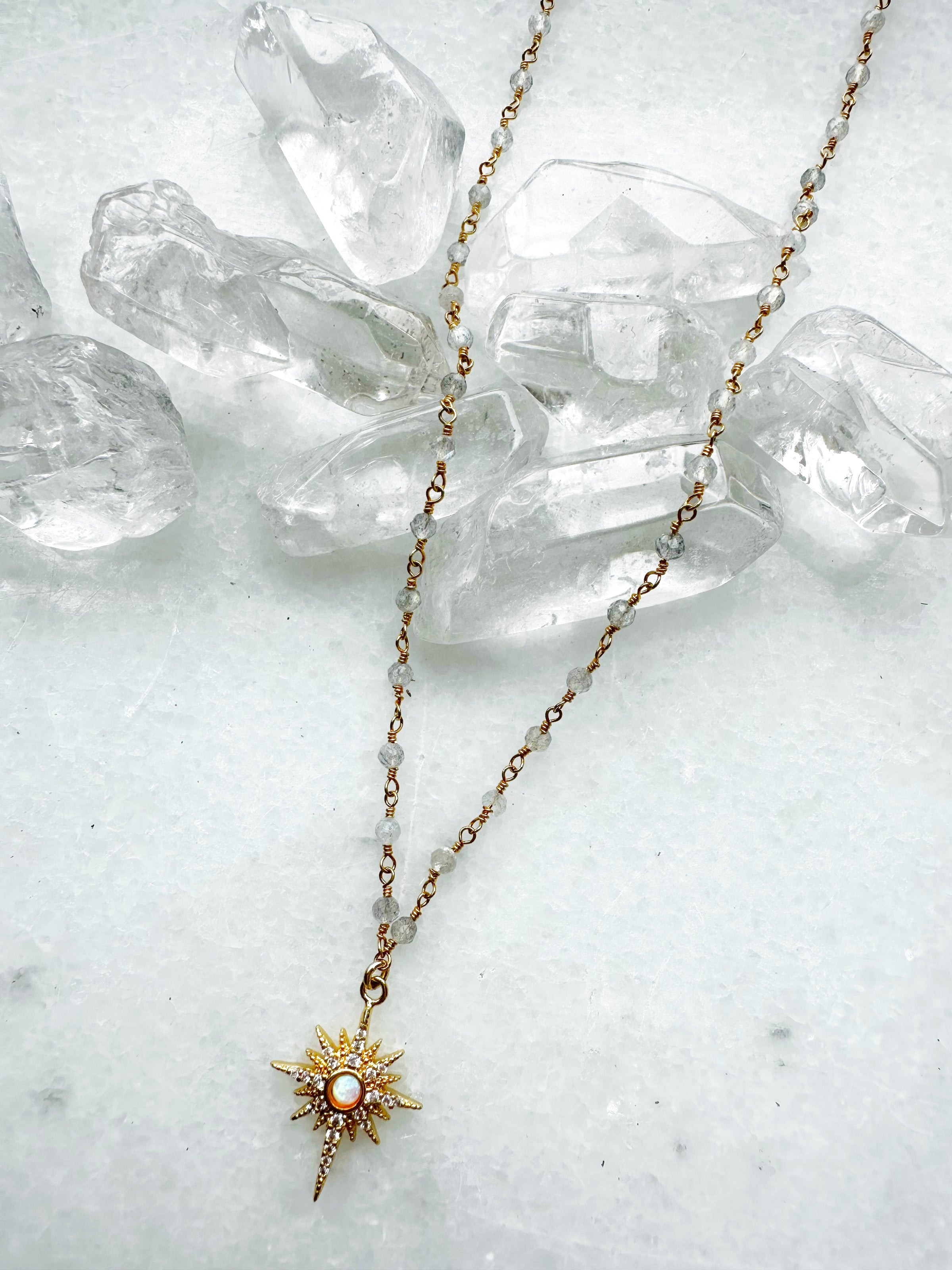 Elevate your everyday style with this wire-wrapped gemstone necklace featuring a stunning Opal North Star charm. Crafted in 14k gold fill with a beautiful selection of gemstone chains. This piece showcases Luxa's signature paperclip clasp design. Handmade in the USA, this versatile necklace brings celestial-inspired elegance to any look.