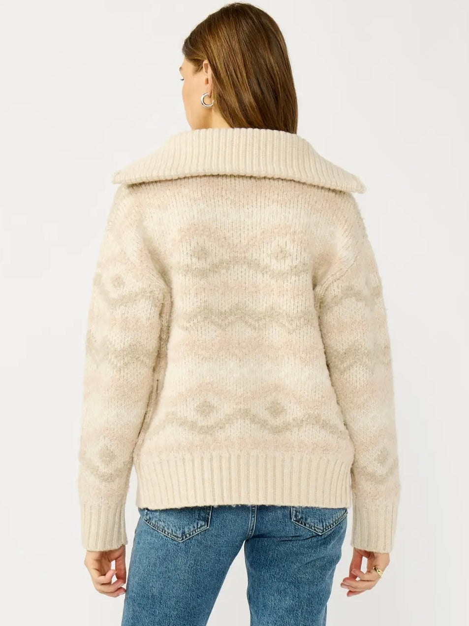 This cozy fair isle front zip sweater features a classic ribbed collar with double layer construction and long sleeves that showcase the traditional Nordic inspired geometric pattern in soft neutral tones. The full front zipper extends from the ribbed neckband to the bottom hem, complemented by practical side pockets and finished with a comfortable ribbed hem that hits perfectly at the hip for a timeless, versatile layering piece.