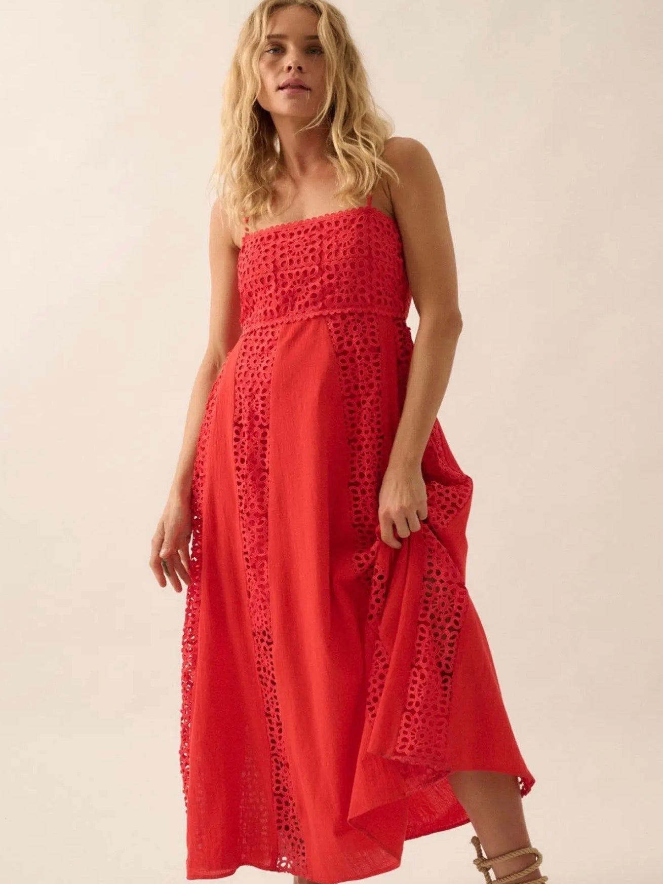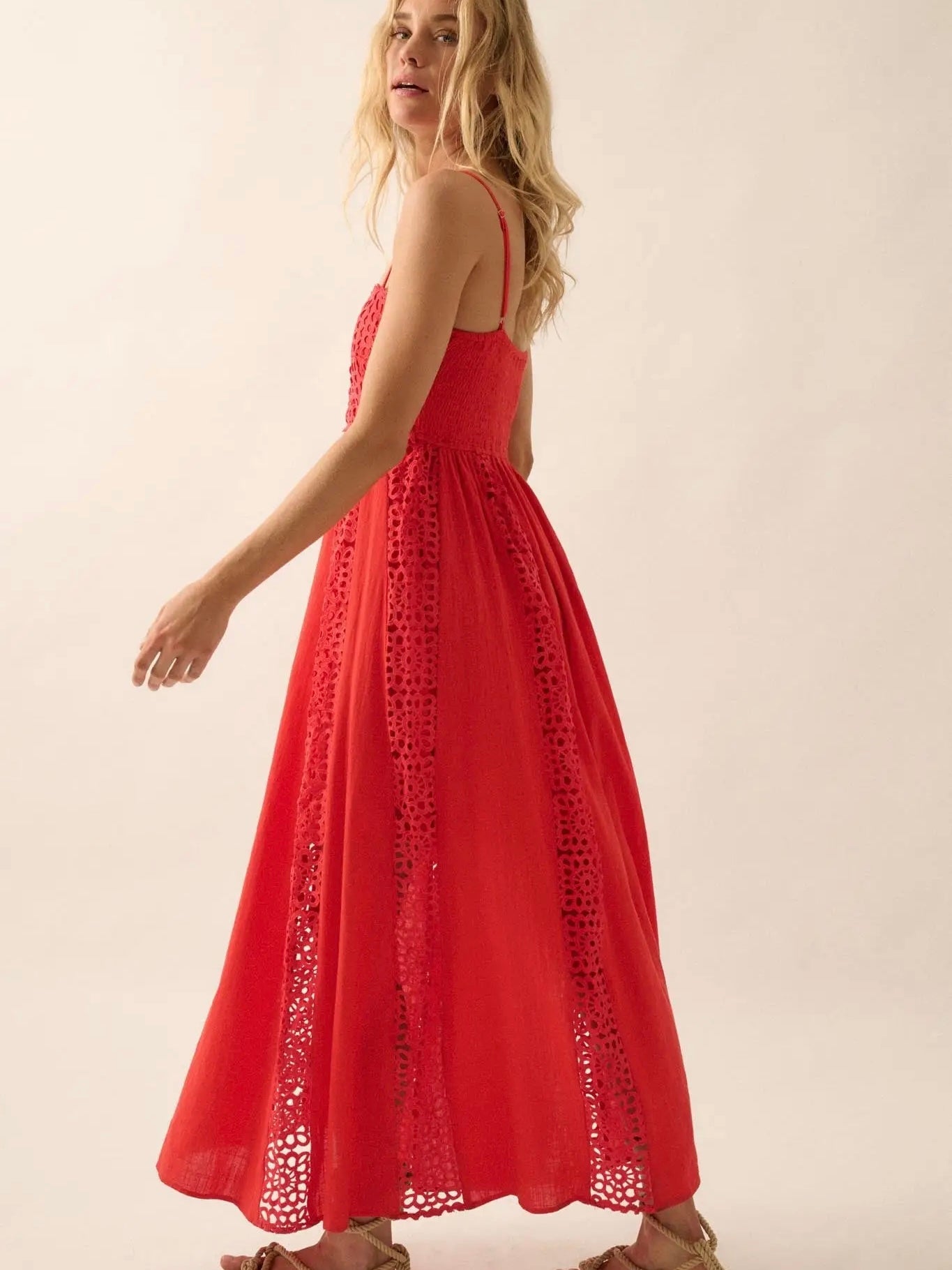 This striking red maxi dress combines delicate crochet lace with fluid crepe for an elegant silhouette. The straight neckline frames the intricate crochet lace bodice, finished with refined scalloped trim. Sleeveless design features adjustable cami straps for a customizable fit, while the low back showcases elastic smocking for subtle texture and movement. The paneled skirt alternates between lace and crepe sections, creating visual depth and dimension. Perfect for evening events or sophisticated occasions where refined craftsmanship matters.