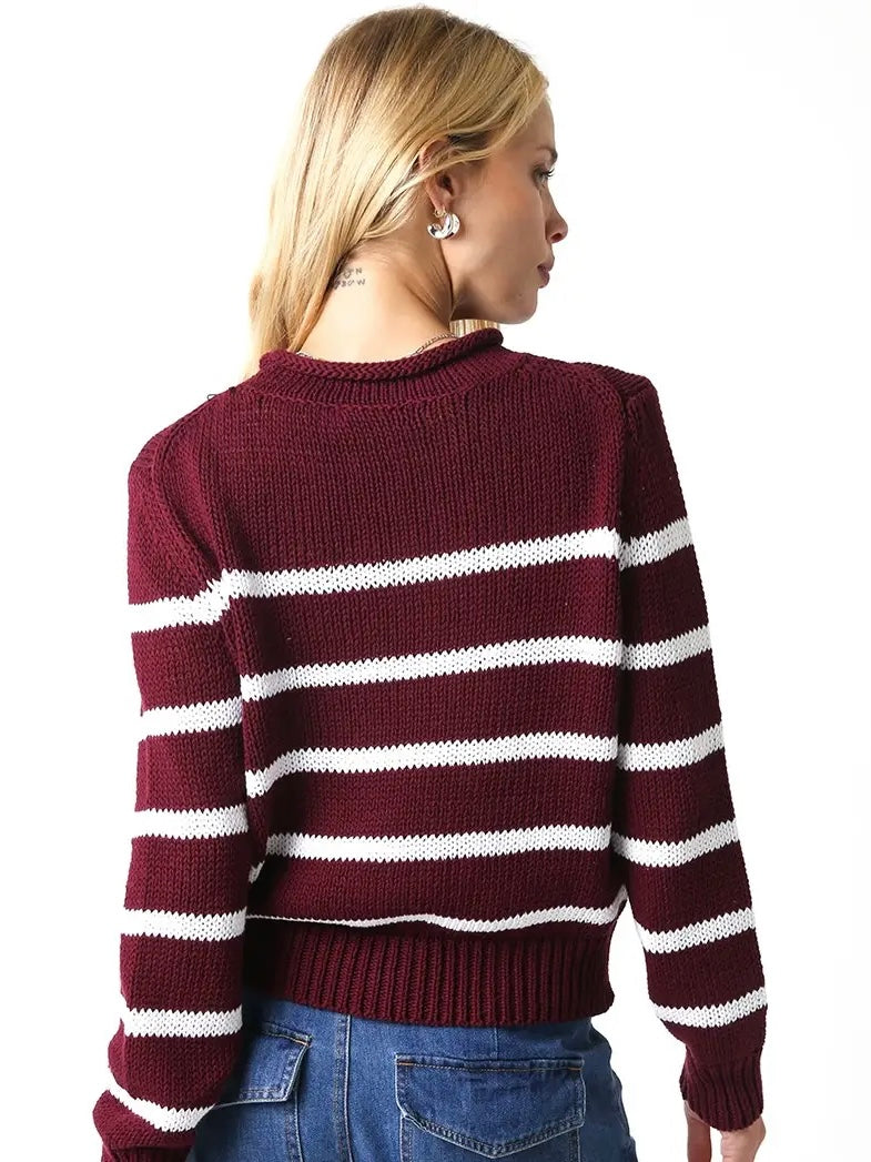 Cozy up in the playful charm of our Leah Sweater, sporting a fun round neck and comfy long sleeves. Crafted from soft cotton, this burgundy sweater comes alive with cheerful cream stripes — perfect for adding a splash of warmth and color to any day. Easy to love and even easier to wear!