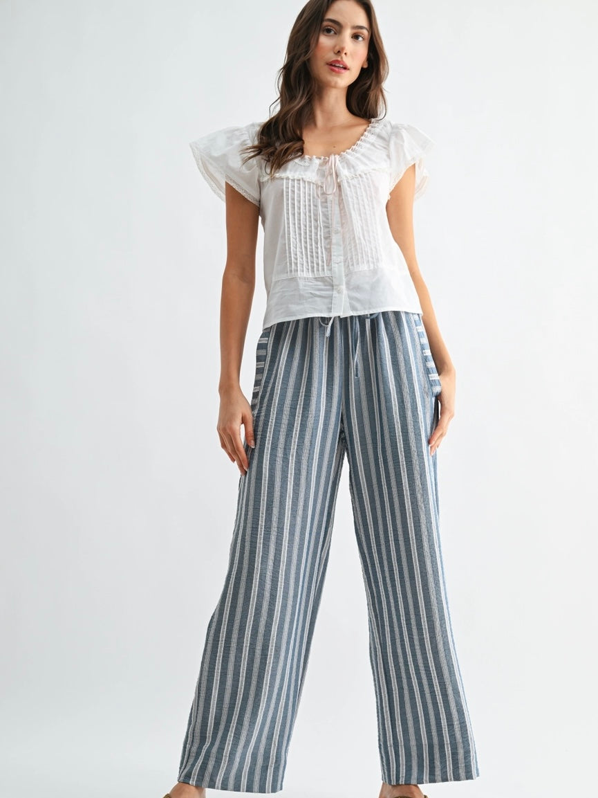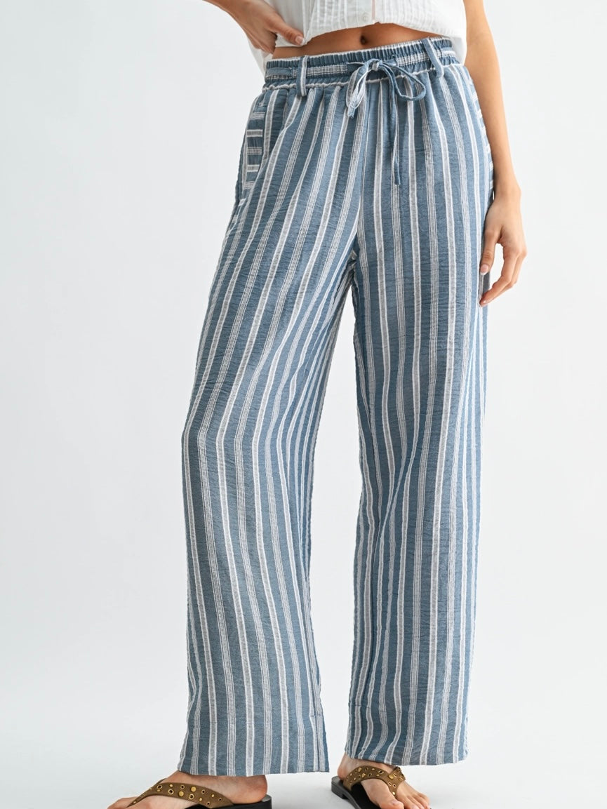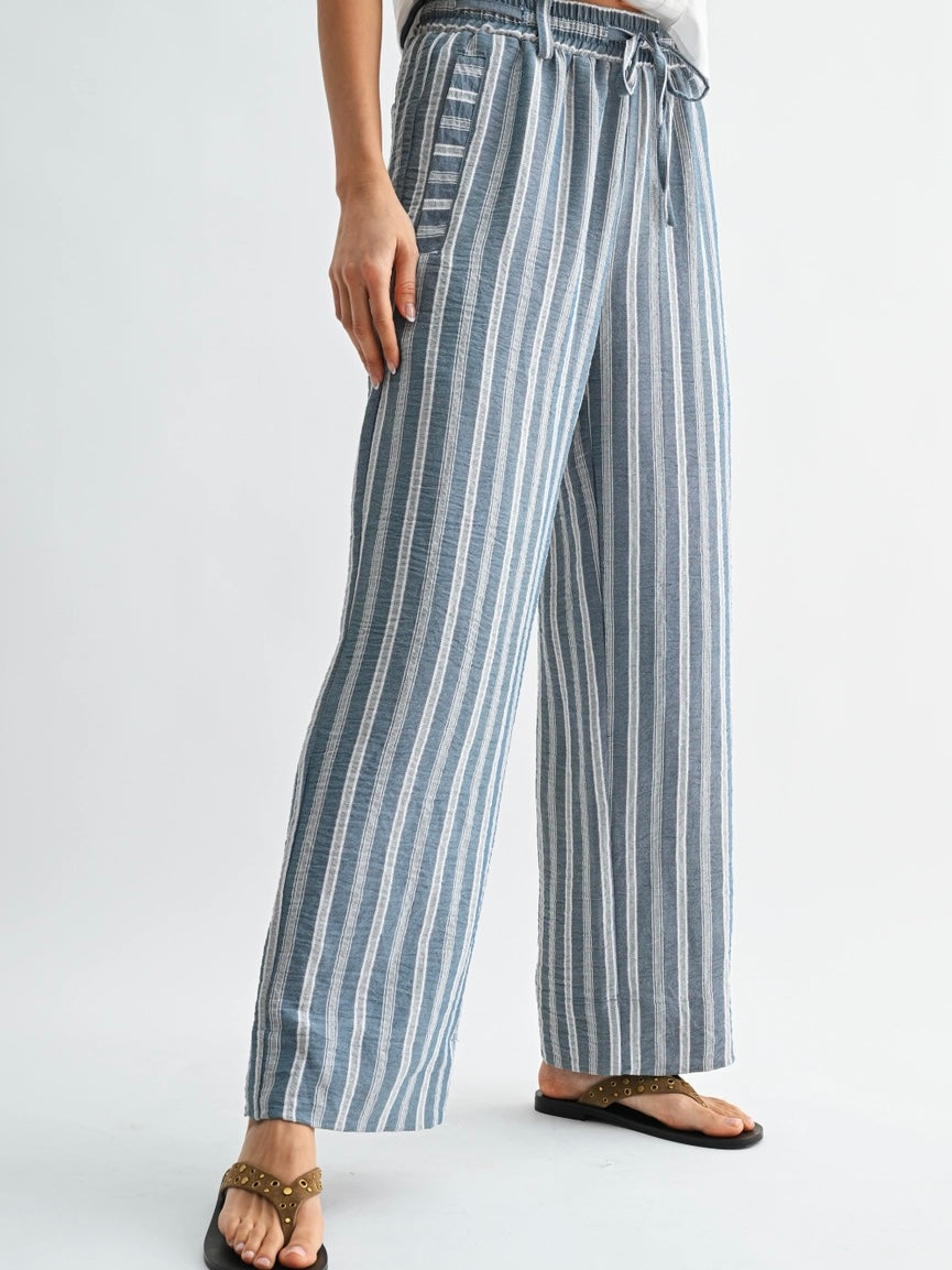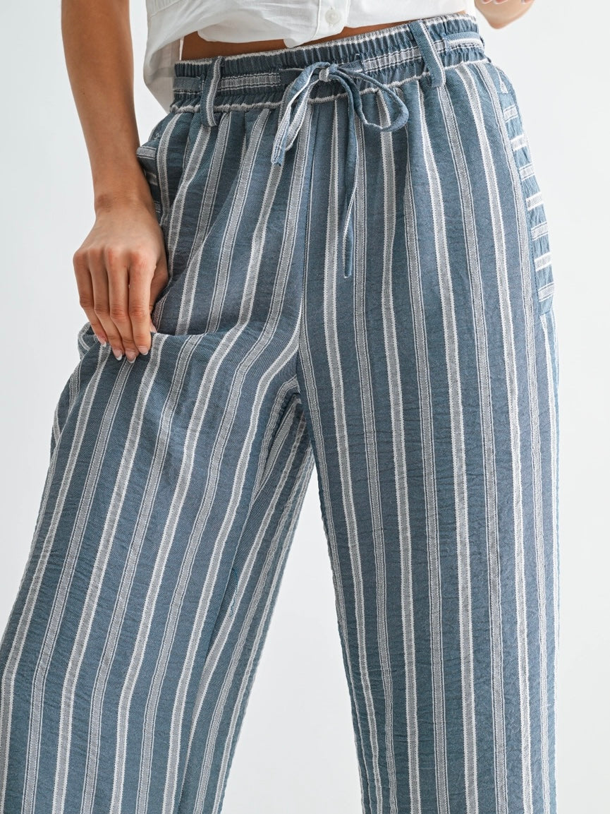 Effortlessly versatile, these wide leg striped pants deliver comfort and style for any occasion. The vertical blue and white stripe pattern creates visual interest, while the straight leg silhouette flatters various body types. An elastic waistband paired with an adjustable drawstring ensures a personalized fit, and functional side pockets add everyday practicality. Crafted from a breathable polyester-rayon blend, these pants move with you throughout your day.