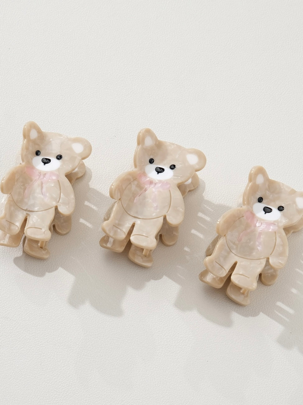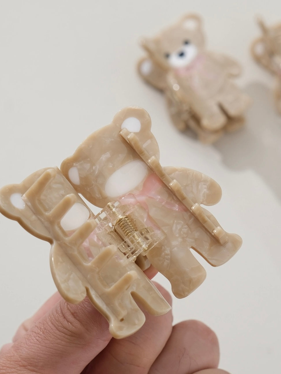 Our adorable Teddy Bear claw features a pink bow in a beige color. Made with eco-friendly material that is both durable and comfortable. Measurements: 6cm x 4cm Materials: Cellulose Acetate (eco-friendly material) Cellulose Acetate is a synthetic fiber produced from plant derivatives such as wood pulp and cotton. CA is both durable and biodegradable. Compared to acrylic and PVC materials, you will see that our clips will last you longer. This material has flexible teeth allowing maximum comfort.