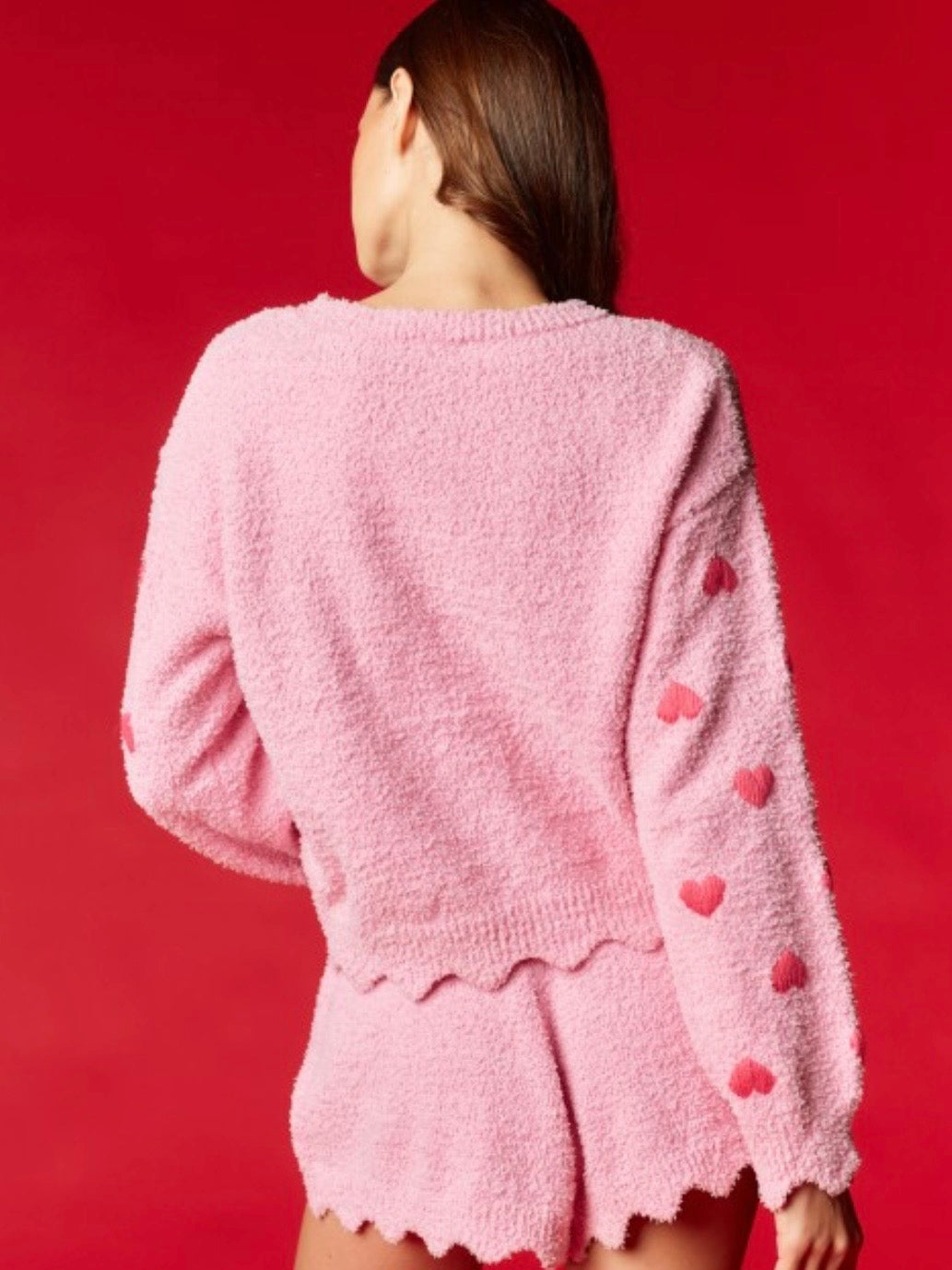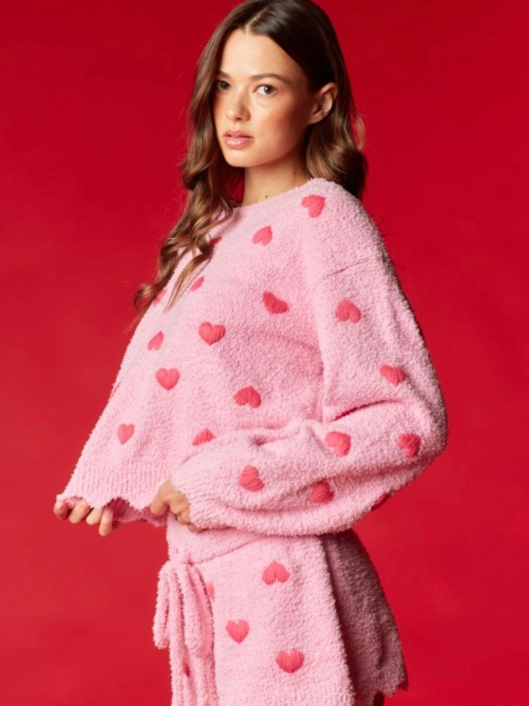 Indulge in effortless comfort with this charming short, featuring an all-over heart jacquard design in warm red tones against a soft pink base. The plush, stretchy fabric delivers a luxurious feel against the skin, while the relaxed crewneck silhouette and long sleeves provide understated elegance. Ideal for intimate evenings at home, seasonal celebrations, or as a thoughtful gift for someone special.