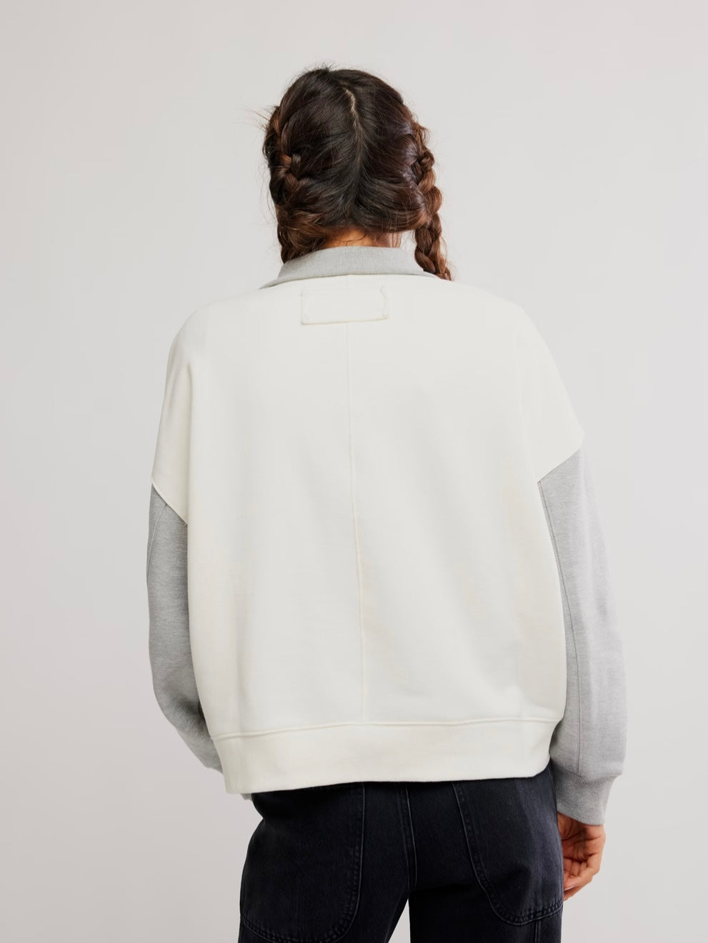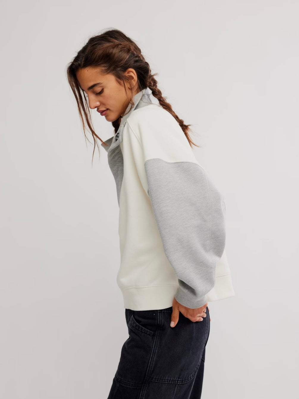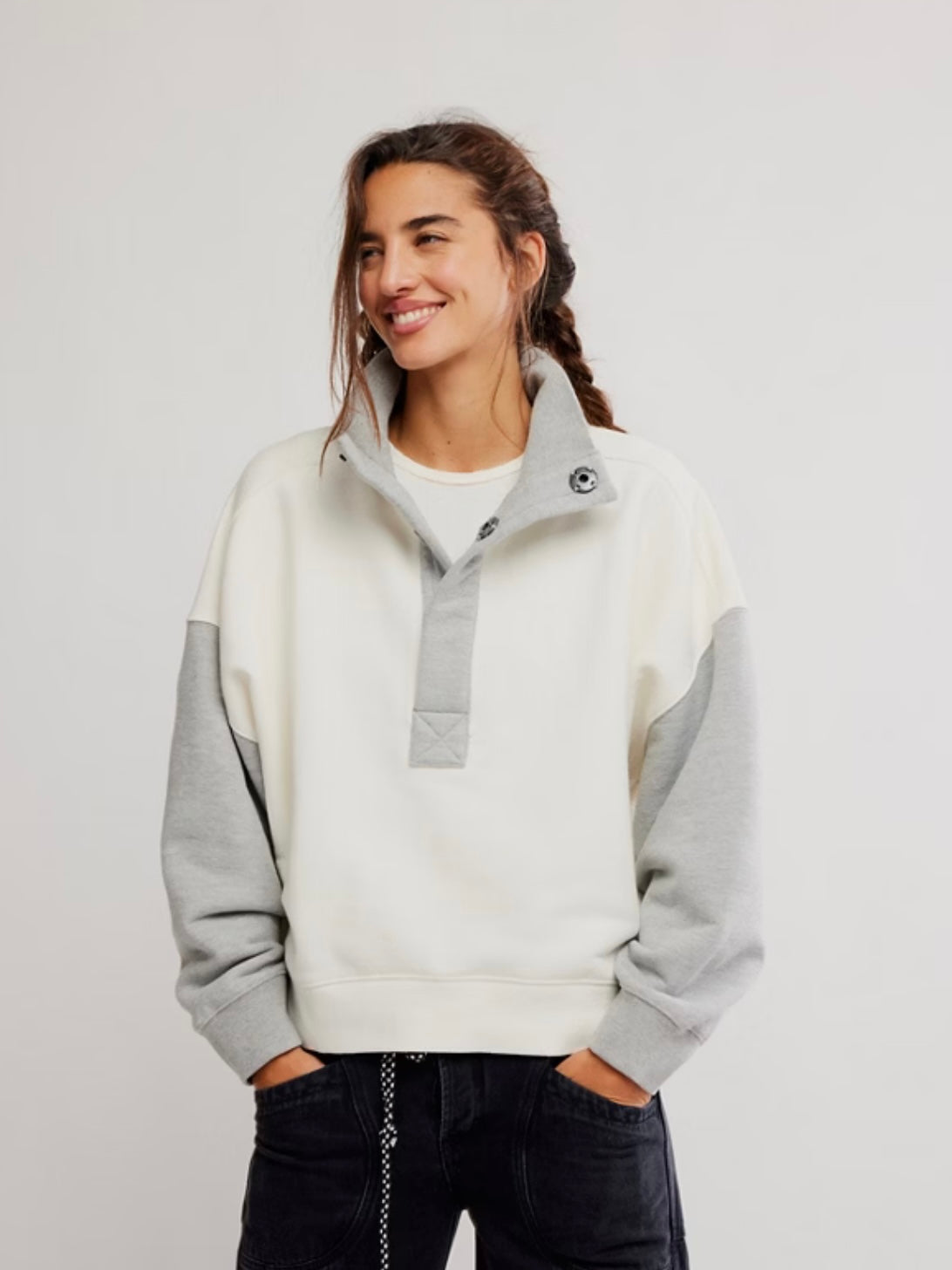So cozy and essential, this wear-everywhere pullover features a funnel neck design with quarter-button detail and ribbed trimming for added dimension.