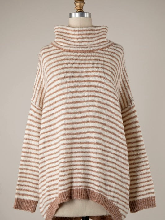 Elevate your layering game with this sophisticated two-toned turtleneck sweater, featuring a striking rust and cream stripe pattern. The high-low hemline adds contemporary movement and dimension to your silhouette, while the loose fit ensures comfort without compromising style. Crafted from quality knit fabric, this piece transitions seamlessly from casual weekends to polished office settings. The classic turtleneck neckline provides warmth and a refined aesthetic that pairs effortlessly with tailored trousers, denim, or midi skirts. A versatile essential that anchors any seasonal wardrobe.