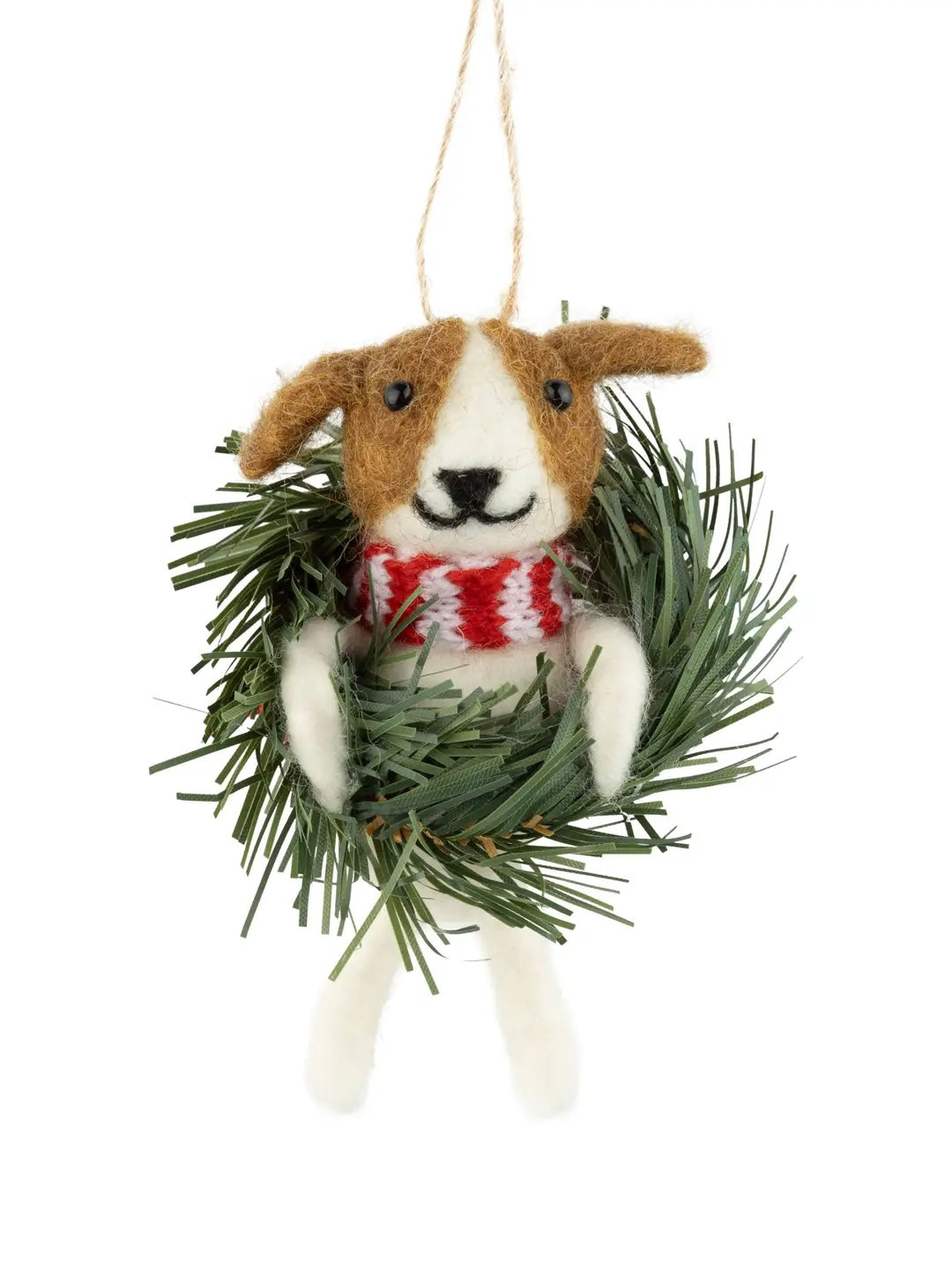 Charming 4-inch felt ornament featuring a dog nestled in a festive wreath, adorned with a red and white scarf. Crafted with attention to detail, this piece brings warmth and sophistication to holiday decorating.