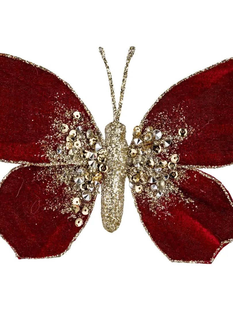 This velvet red and gold butterfly clip ornament brings refined elegance to your seasonal displays. Featuring sumptuous velvet petals in deep crimson with lustrous gold embellishments, the butterfly design captures graceful movement and luxury. Ideal for trees, wreaths, or gift embellishments, it delivers sophisticated holiday styling with its rich color palette and premium craftsmanship.